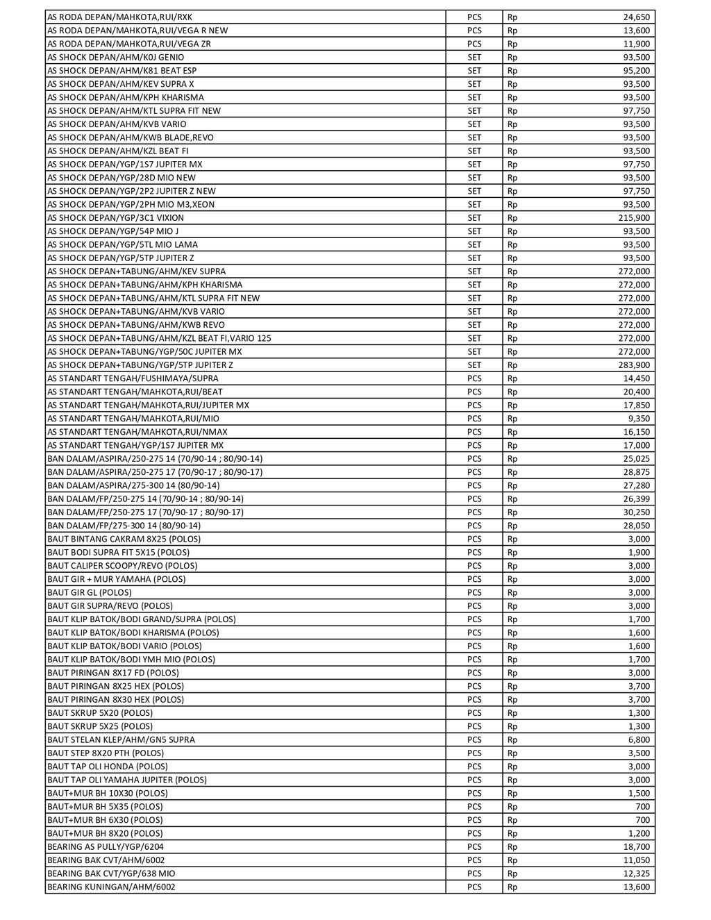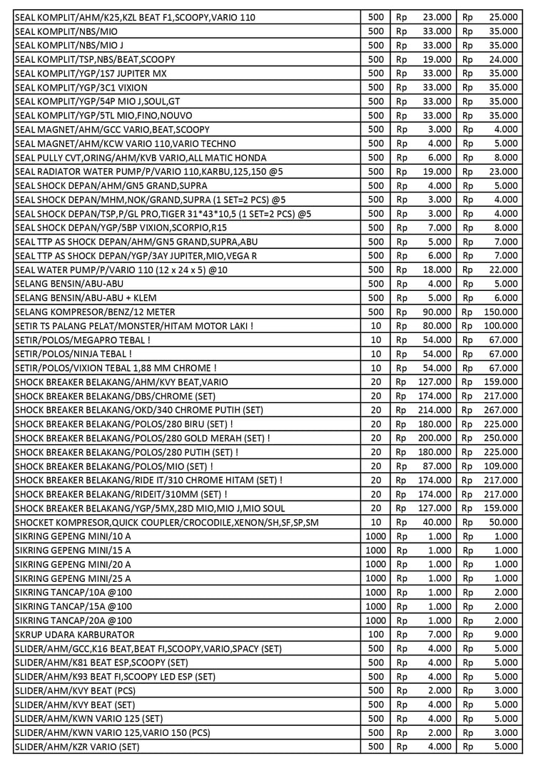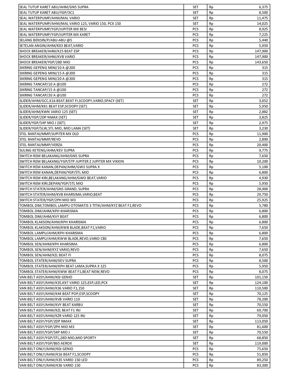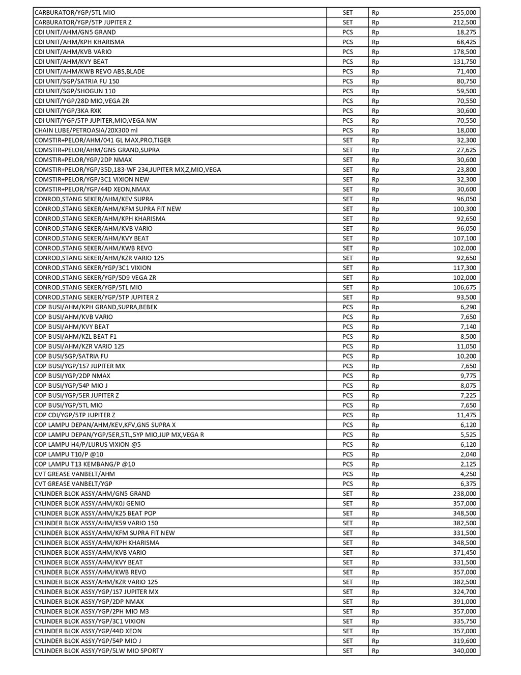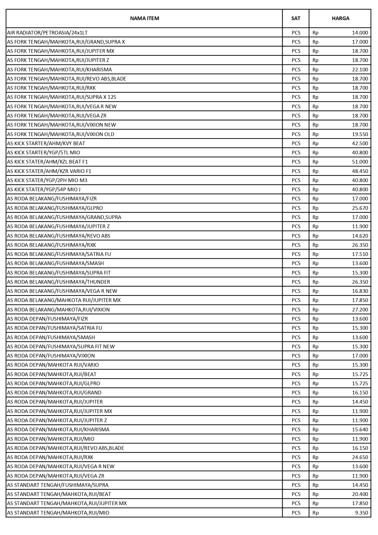 PRICELIST SPAREPART DAN OLI MOTOR 2023-2024
