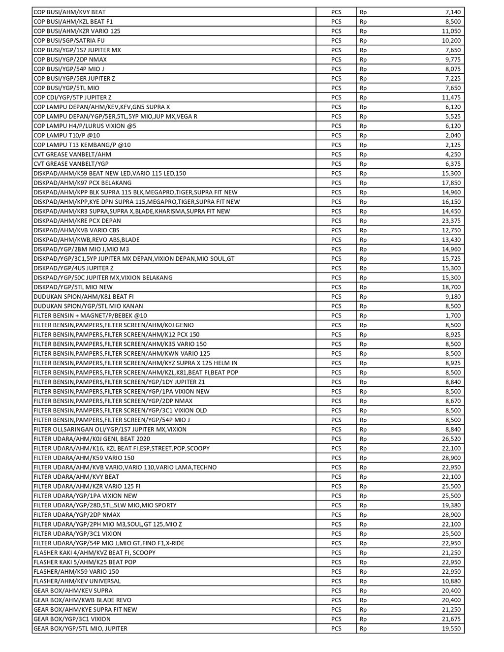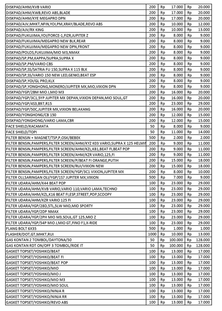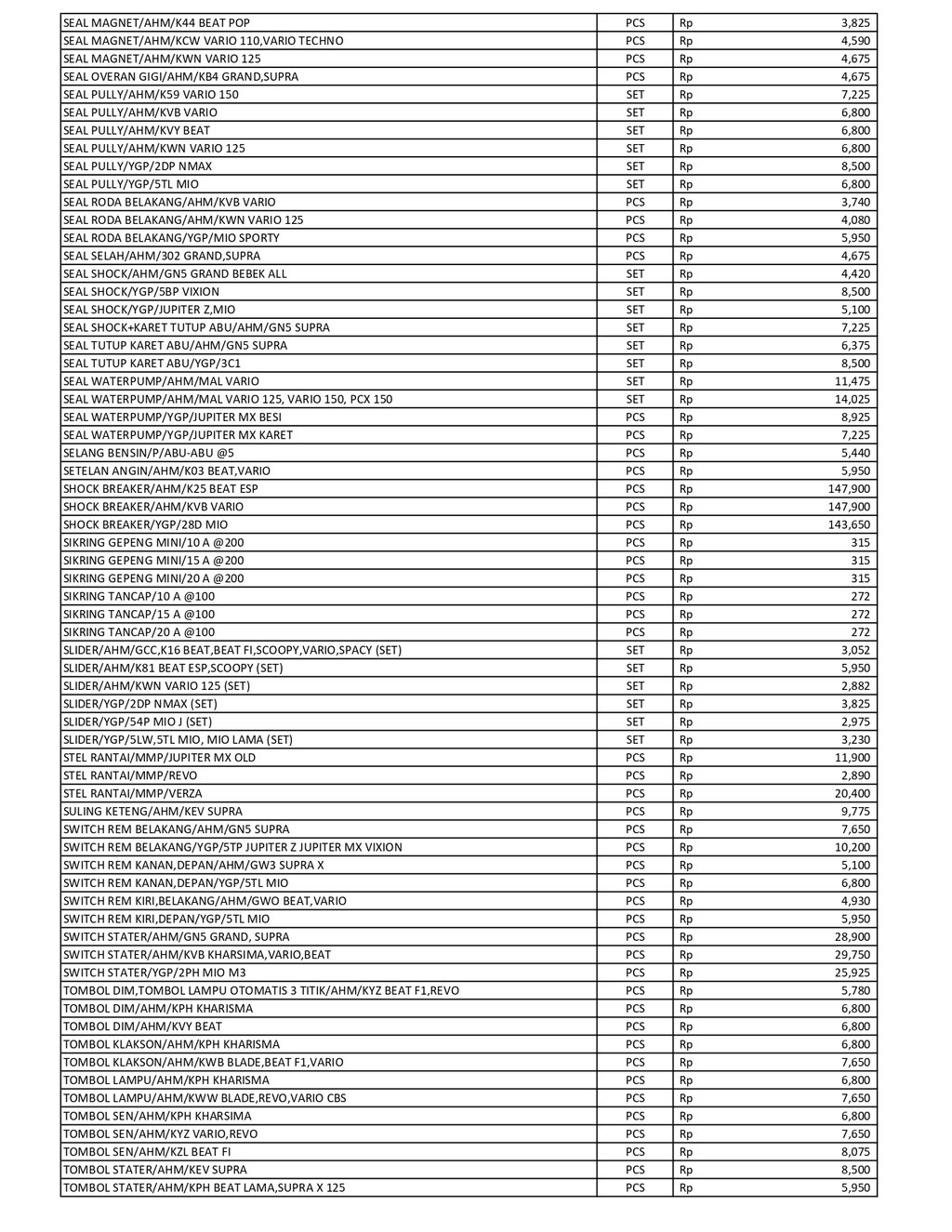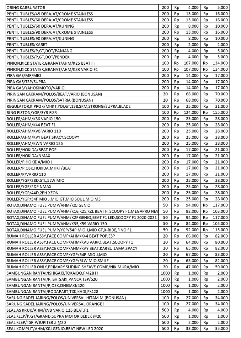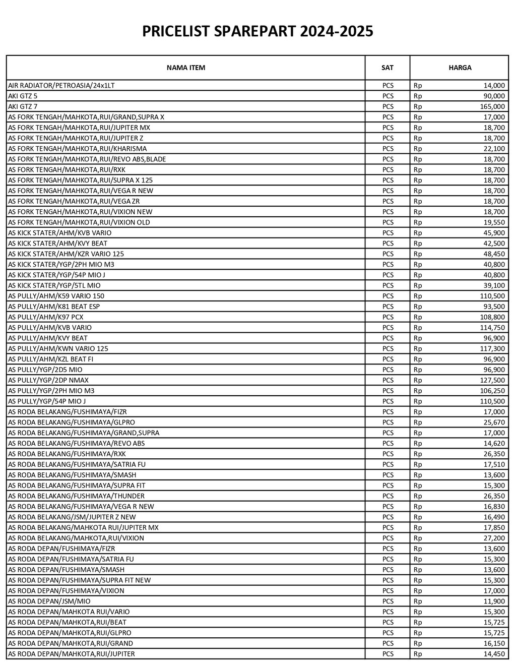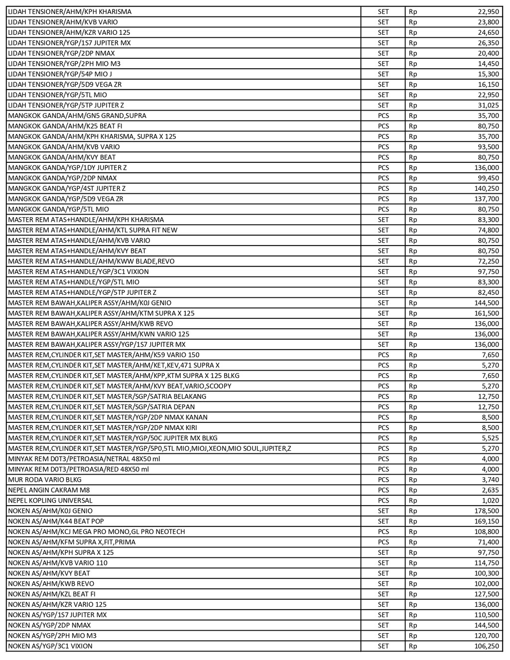 PRICELIST SPAREPART DAN OLI MOTOR 2023-2024
