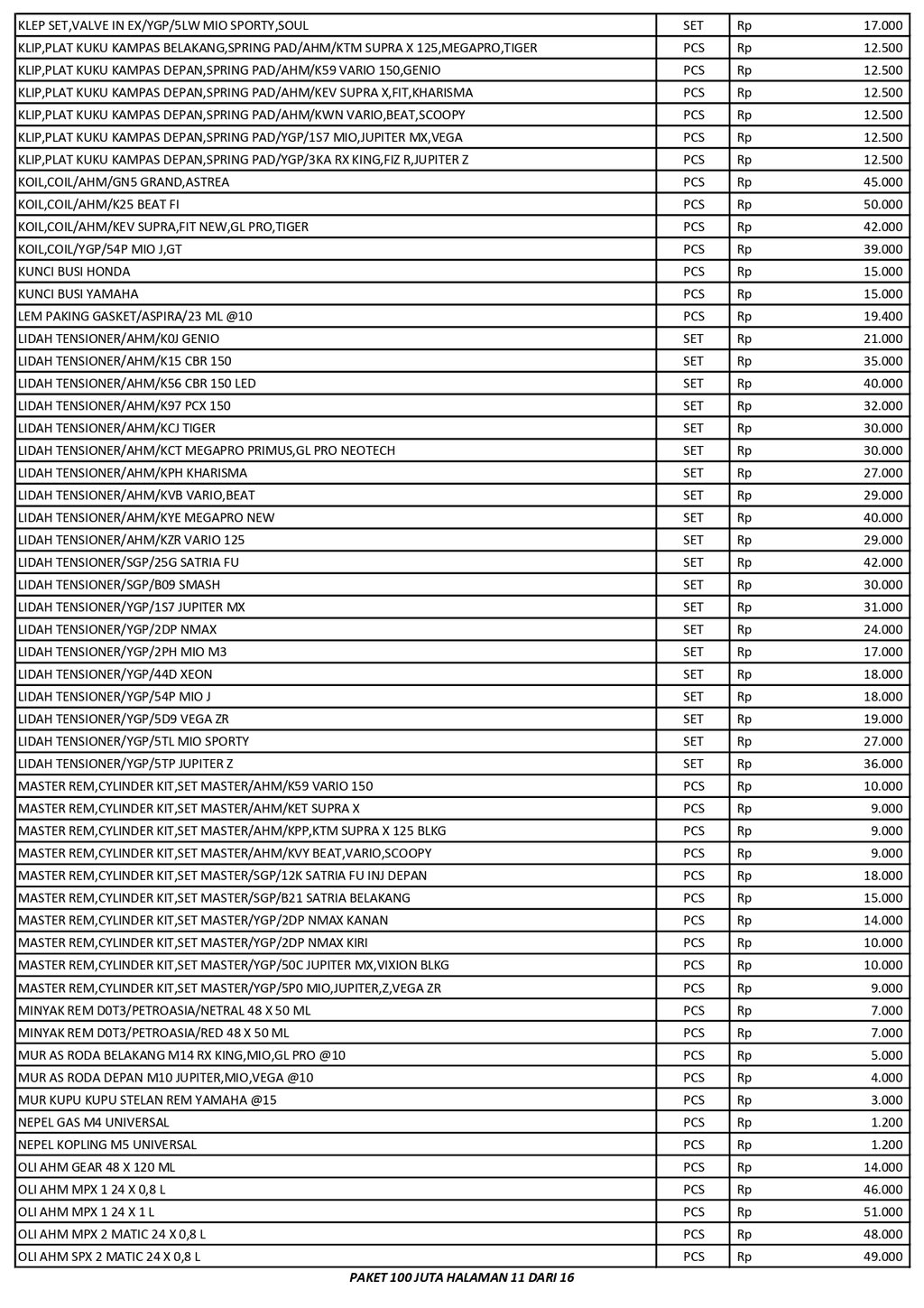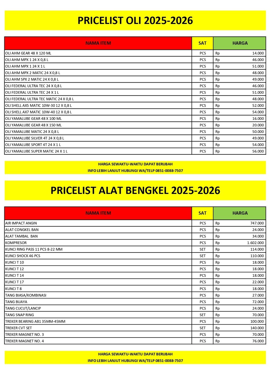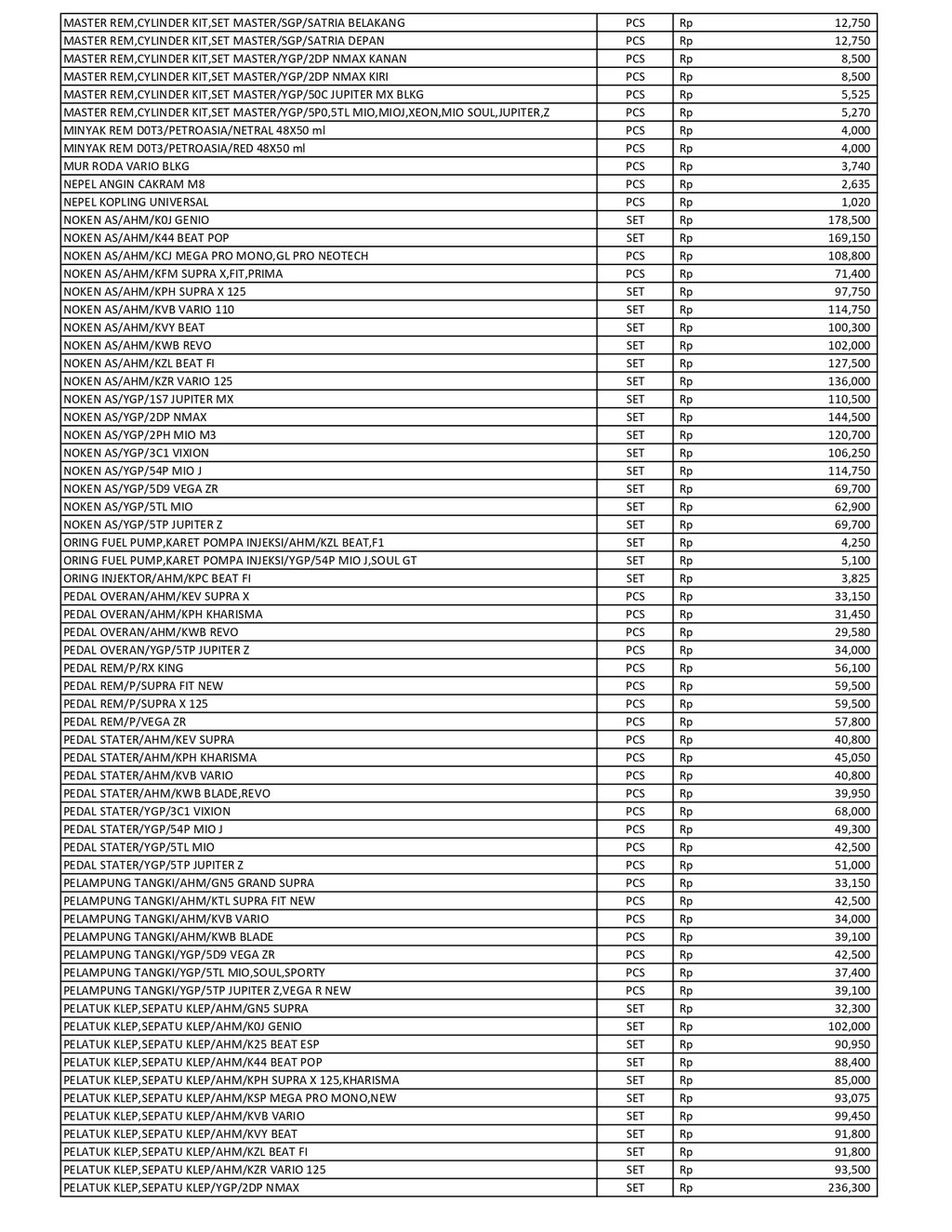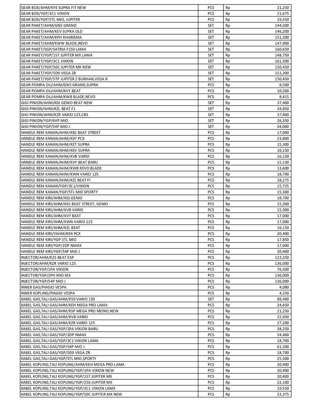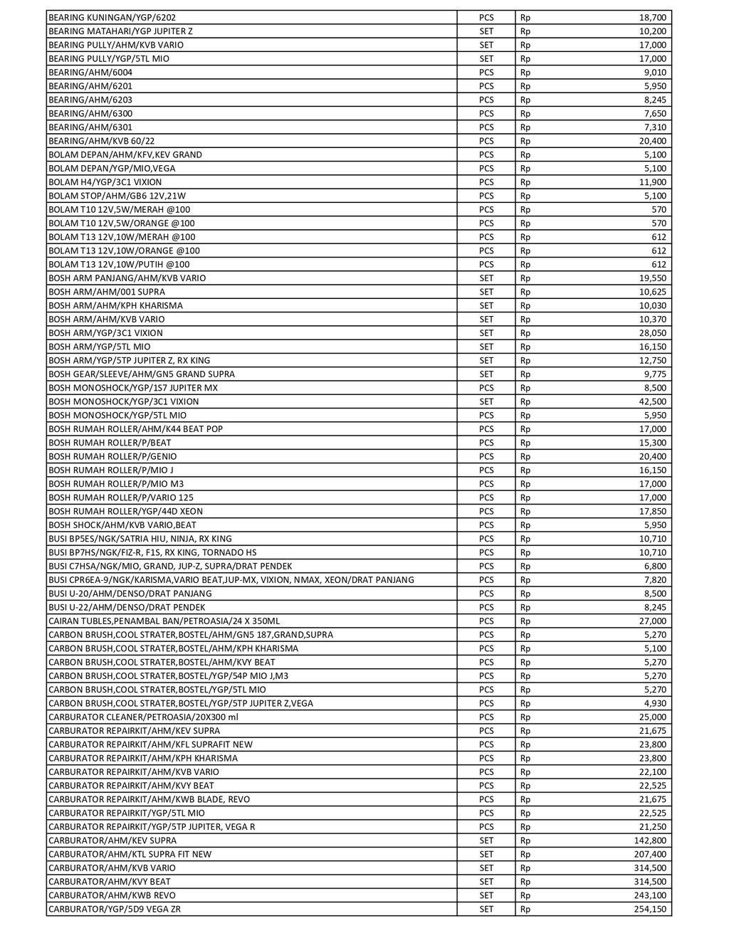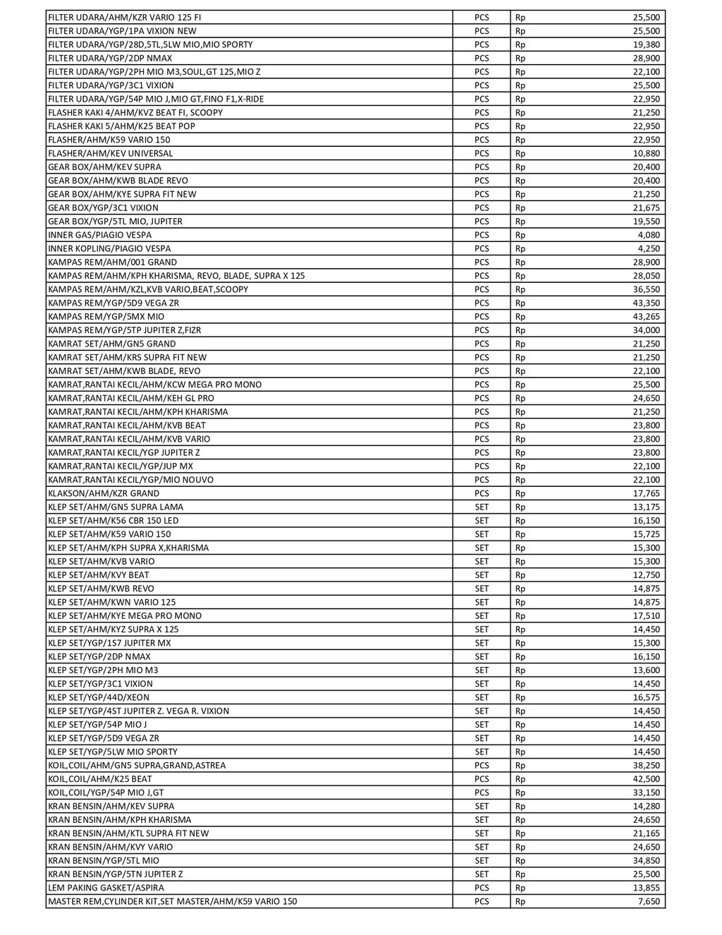 PRICELIST SPAREPART DAN OLI MOTOR 2023-2024