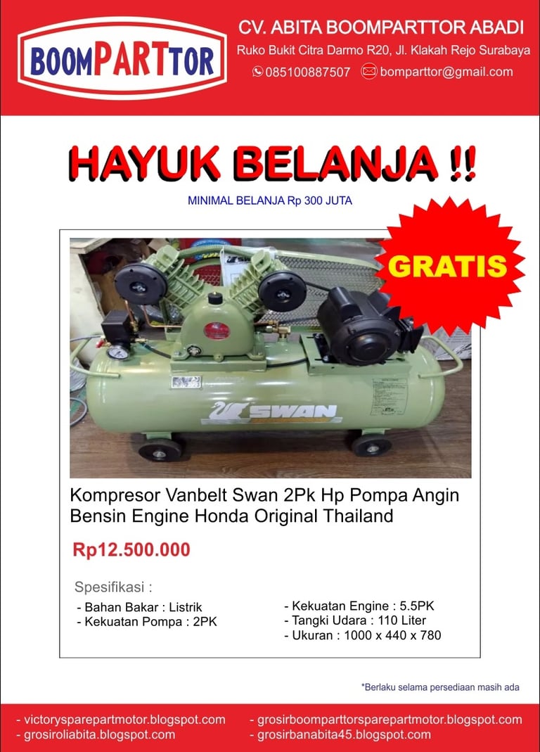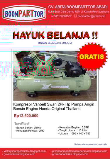 Melayani pembelian grosir maupun ecer melalui offline store ataupun online (Shopee). Untuk para pelanggan kami yang akan membuka bengkel, kami menyediakan paket bengkel dan juga konsultasi gratis dengan menghubungi no 085100887507.
